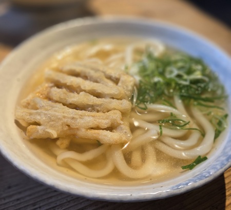 こちらでわたくしは「ごぼう天うどん」を。連れの豊美氏は「えび天うどん」を。